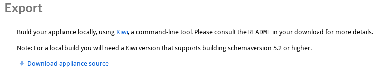 To do this got to the Build tab, click Export your appliance's Kiwi configuration and then click Download appliance source.